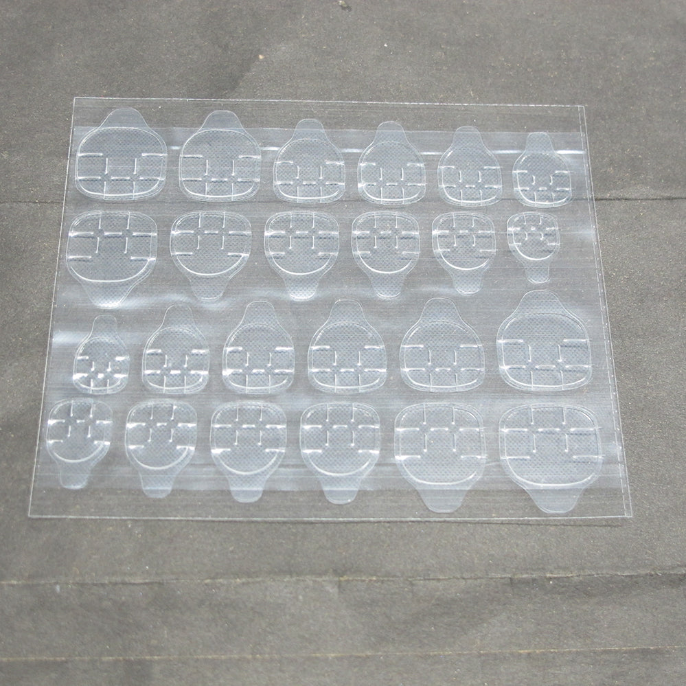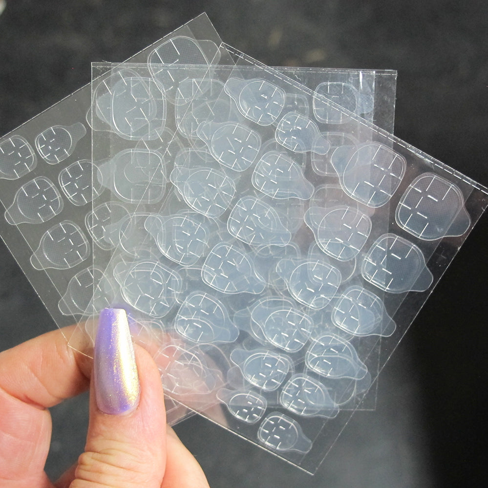 - Press tab firmly onto your nail and remove perforated protective cover exposing the other sticky side