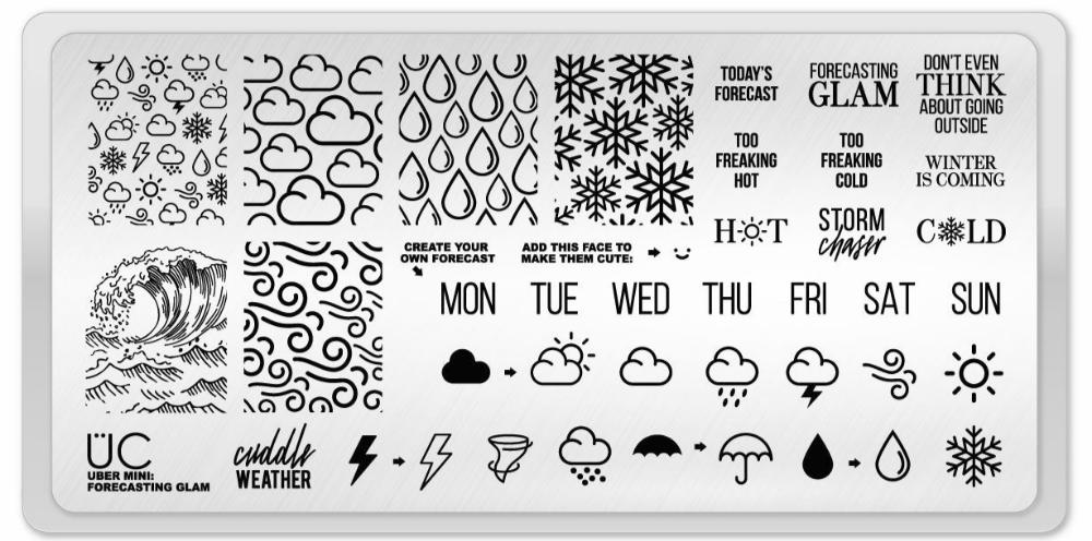 I've always been told that if I can't think of anything to say to talk about the weather - and in Colorado we have a LOT of it. From snow storms one second to hot and dry the next - it's always something we have top of mind. I packed this plate with fun little weather-loving icons and even a smiley face to give your weather icons some personality! Why talk about the weather when you can simply point to your nails and steer the convo towards polish. Everyone LOVES to talk about polish right?? ;) Oh and yes - that little cloud is layerable at the bottom for all the other cloud icons (plus we threw in some more layerable elements - just look for the tiny arrows to guide you!