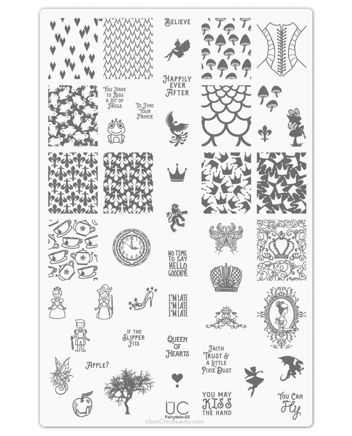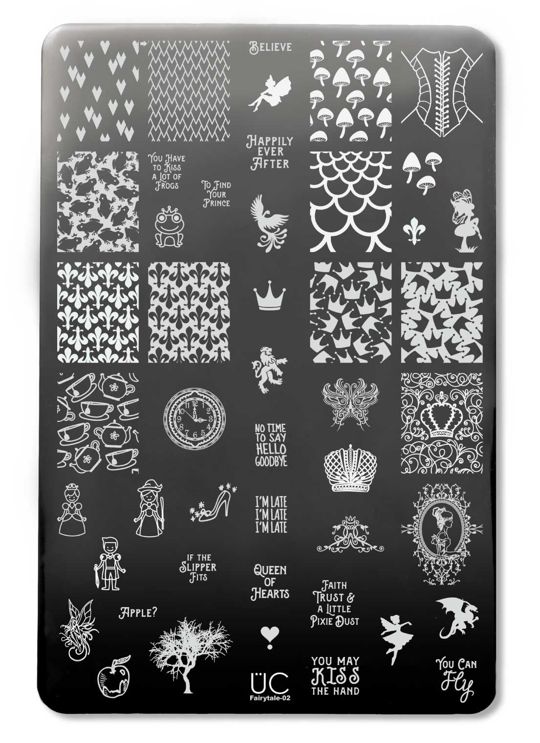 Queen of Hearts! Take a trip down the rabbit hole and embrace our all new Fairytale-02 plate. This plate is so fanciful it even has layered dragon scales (top left) to create a colorful mani in seconds!