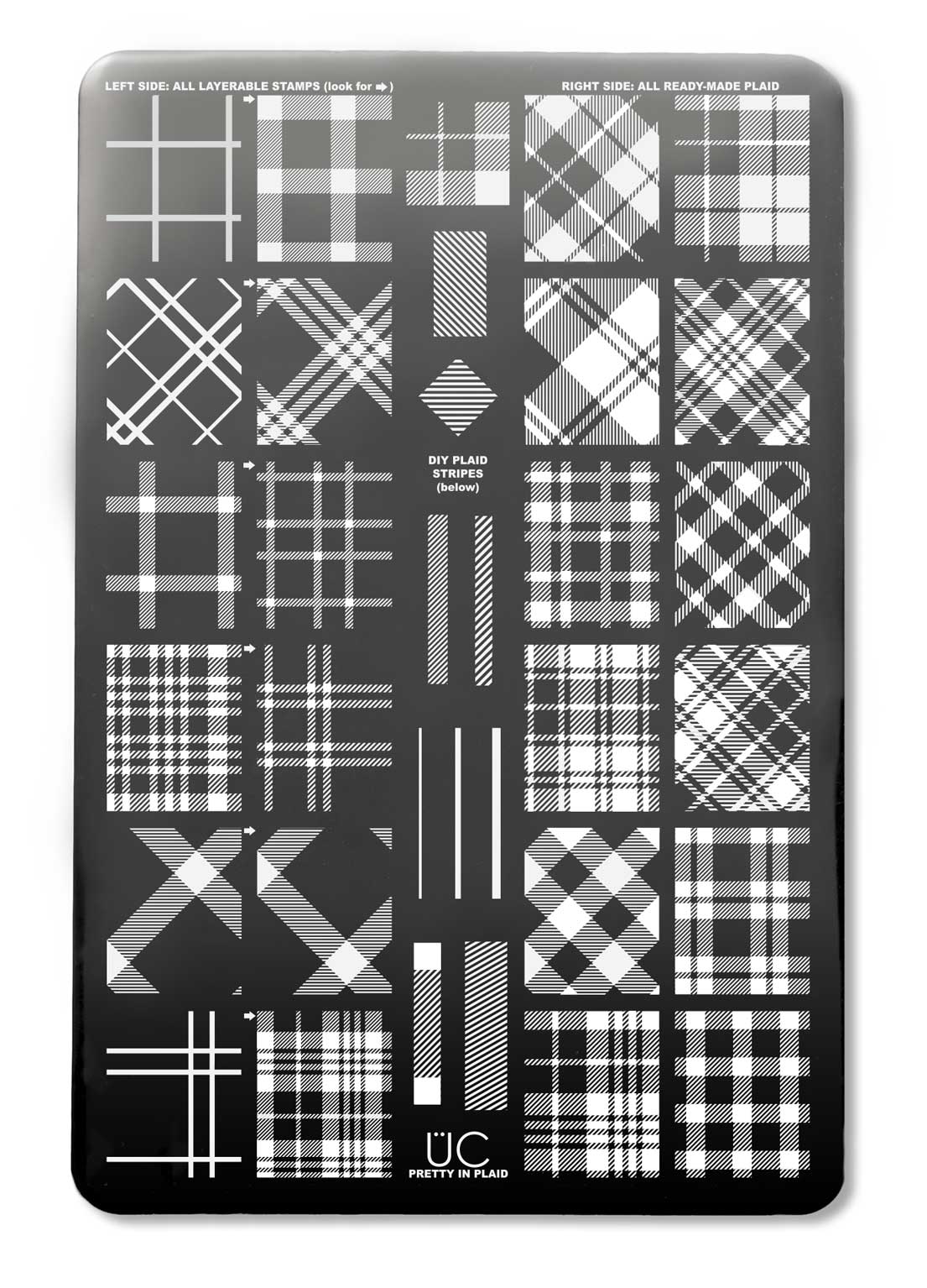 Introducing the plate our customer’s have been begging us to make - it’s finally here! What’s so special? Well first off…PLAID!!! Plus we’ve made our entirely unique by making the entire left side layer-able Plaid designs – complete designs…not just a few pieces you have to put together on your own but complete designs that you can throw together in a snap and wow your friends! …but if you did want some plaid pieces to play with - we have that too right down the middle! We’ve taken care of all your plaid dreams so what are you waiting for? Grab your plate today and play!
