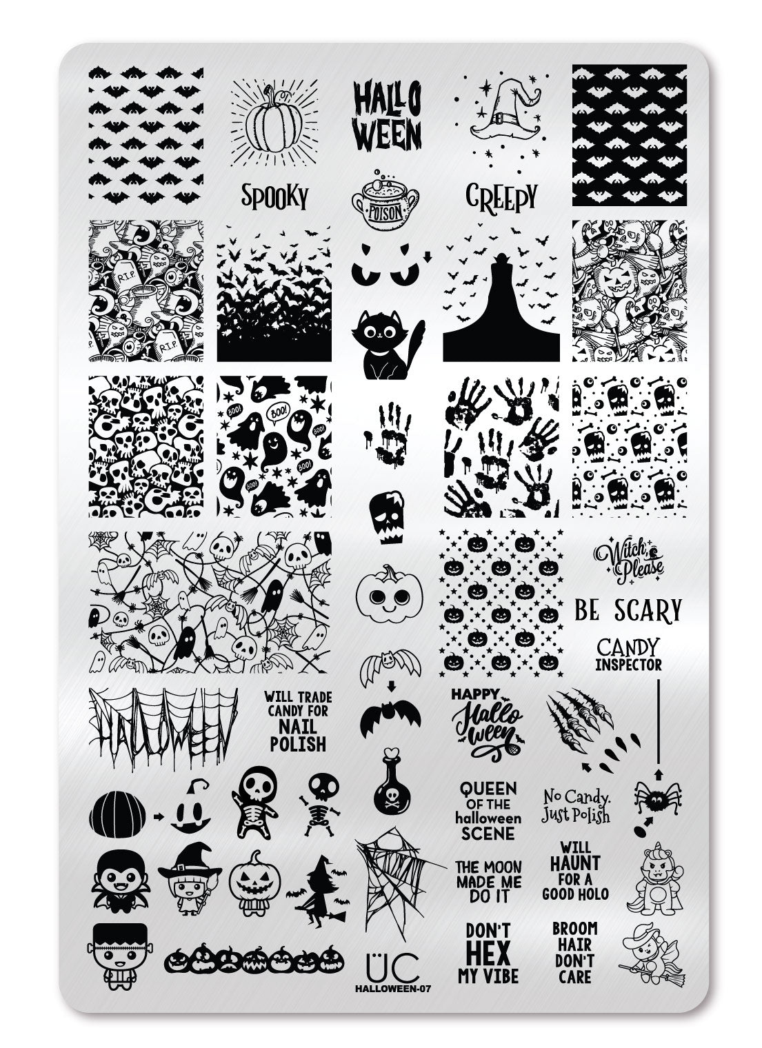 Got a need to be the queen of the Halloween scene? We’ve got you covered! Our newest Halloween plate has all kinds of creepy cute looks to complete your next haunted look. We included some sayings like: “Witch, please”, “Candy Inspector,” “No Candy, Just Polish”, “Will Haunt for a Good Holo,” “Don’t Hex My Vibe,” “Will Trade Candy for Nail Polish,” and many more! Get a batty gradient or add ghoulish eyes - even try out a Unicorn Vampire! Whatever your style - this plate is sure to fill the void in your collection of all things creepy cute.