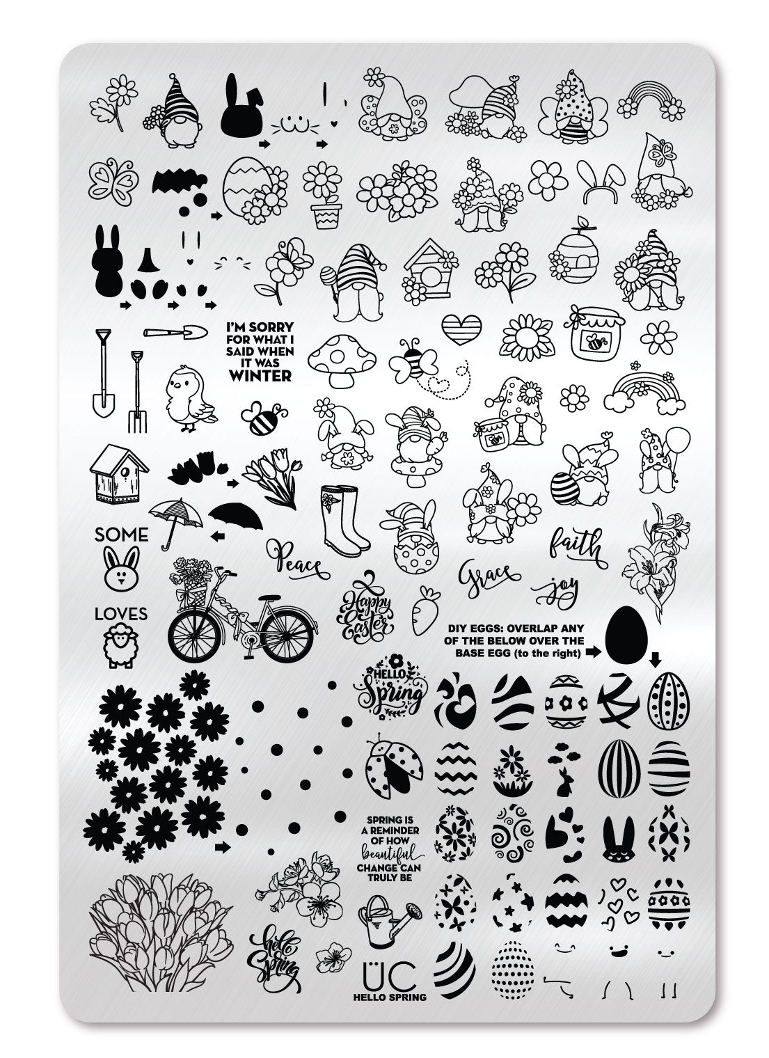 It’s time to get EGG-cited! We have the spring-loving plate you’ve been waiting for! We packed it full of Gnomes, Bunnies, Ladybugs, Tulips, and the best DIY Easter Egg-making layers yet! Includes sayings such as “I’m sorry for what I said when it was winter”, “Hello Spring”, “Spring is a reminder of how beautiful change can truly be” and more!