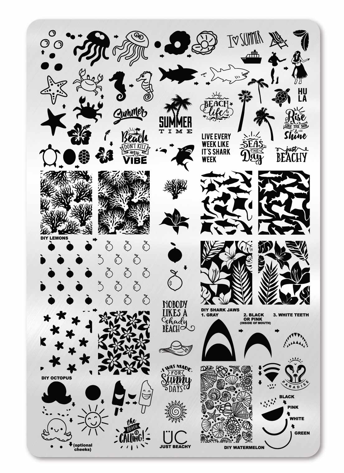 “SEAS the Day” with our all-new summer-loving nail stamp plate! We always love a good summer mani and this plate gives you hundreds of ways to make one. From layerable sea creatures to shark negative space designs to cute sayings like “Live Every Week Like It’s Shark Week”, “Seas the Day”, “Nobody Likes a Shady Beach” and more! Plus: dive deep with our all-new layerable Jaws shark or take a bite out of our layerable watermelon nail stamps! It’s time to welcome Summer!