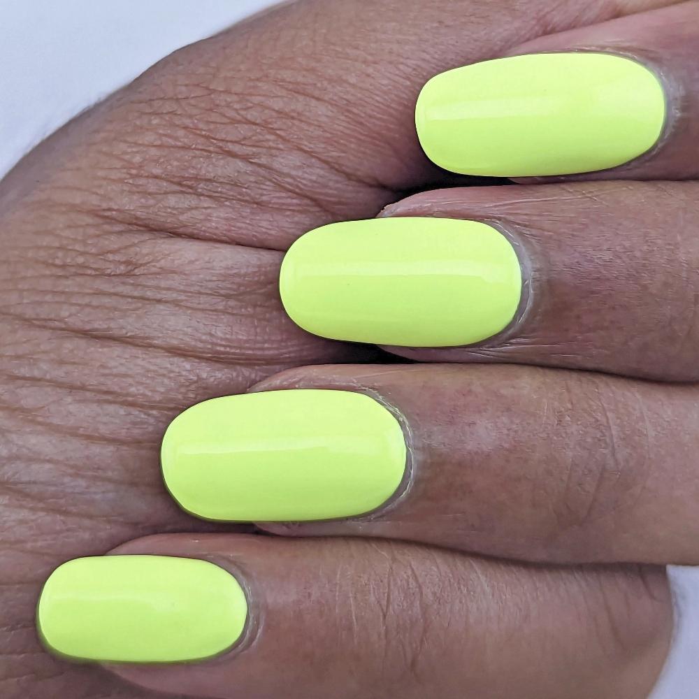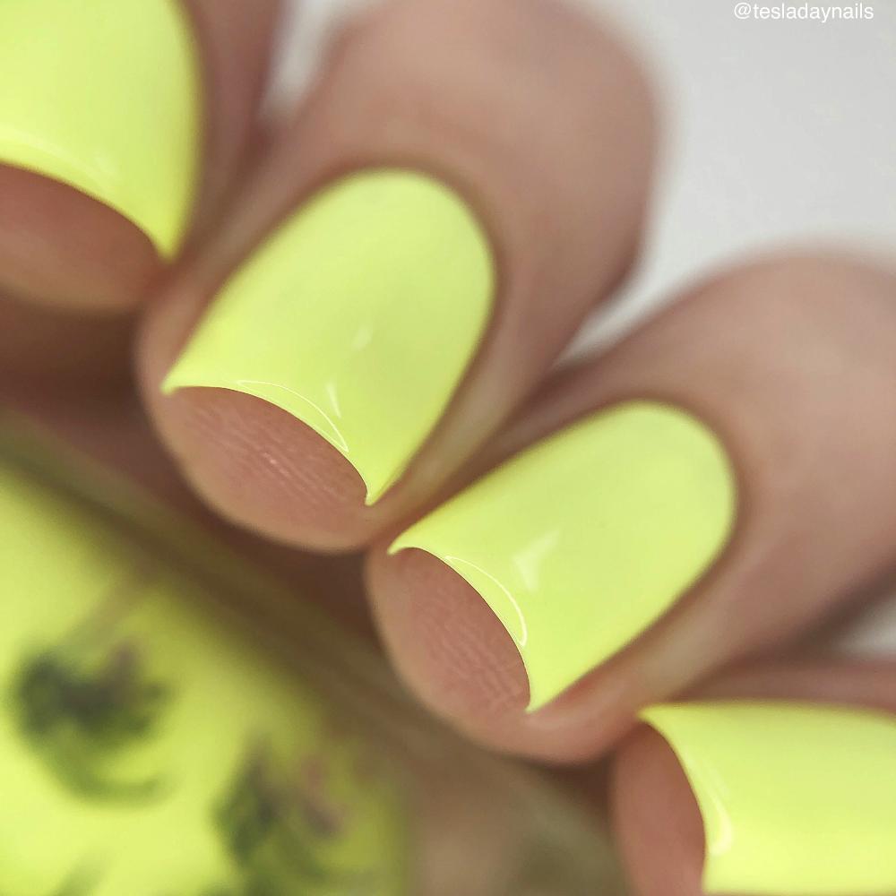 A soft neon pastel yellow. Swatches thanks to @miss_tanababy_ @icanhazpolish @tesladaynails @linz_zombie