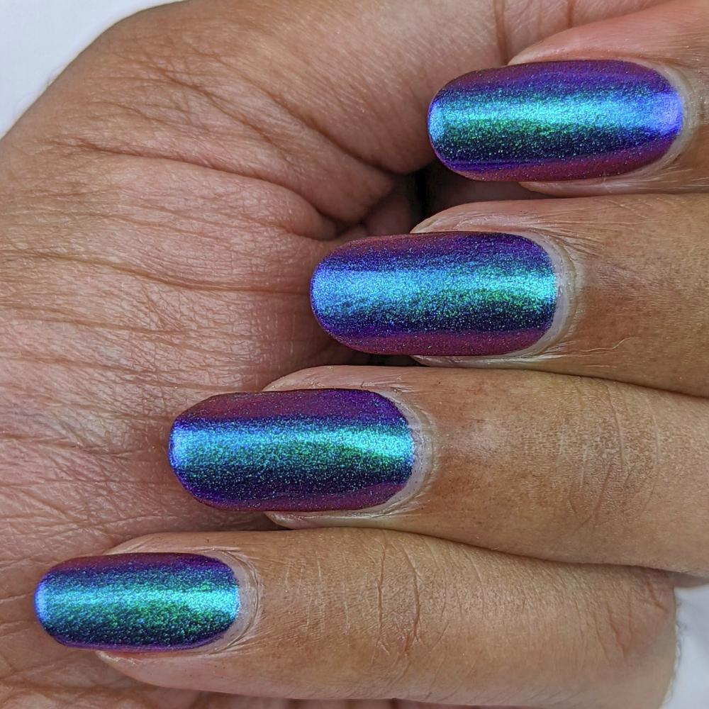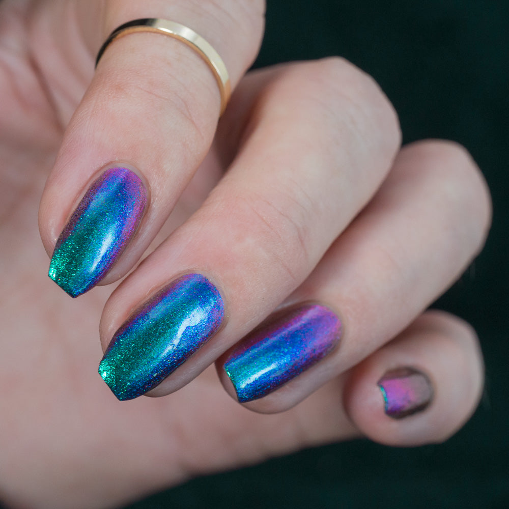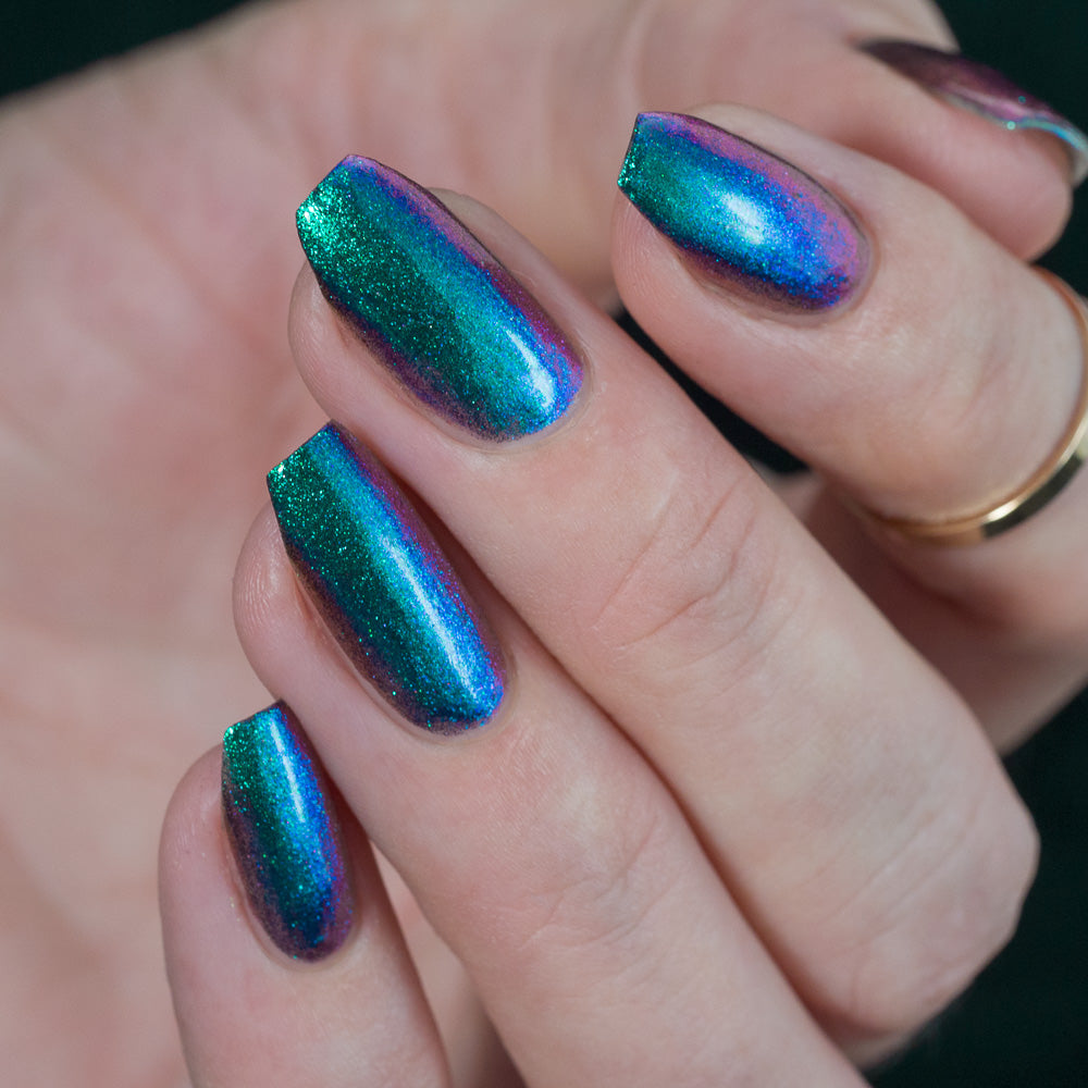 "Riding with Dragons" starts as a brilliant emerald then shifts to teal, blue, purple, violet and magenta. On extreme angles you may see copper and olive. Beautiful swatches thanks to @icanhazpolish, @miss_tanababy_ and @breakrulesnotnails