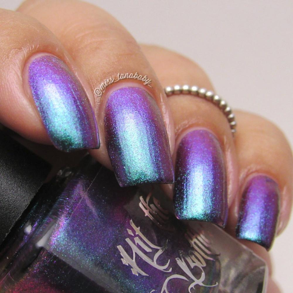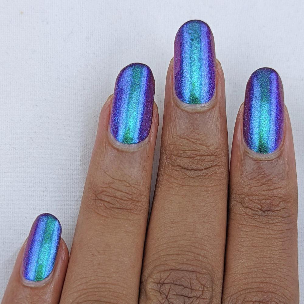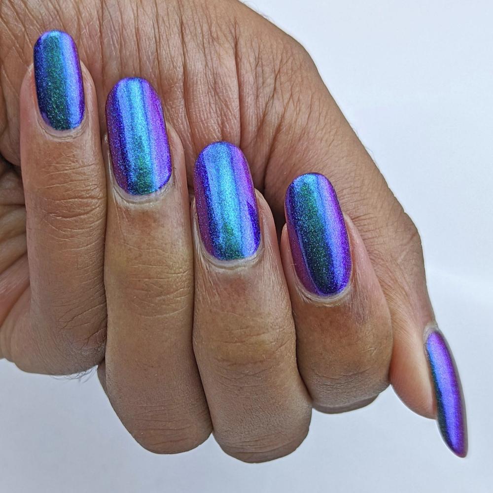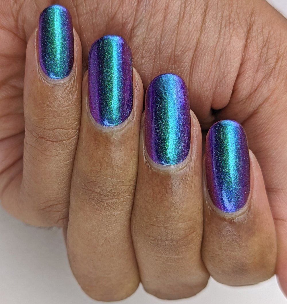 "Riding with Dragons" starts as a brilliant emerald then shifts to teal, blue, purple, violet and magenta. On extreme angles you may see copper and olive. Beautiful swatches thanks to @icanhazpolish, @miss_tanababy_ and @breakrulesnotnails