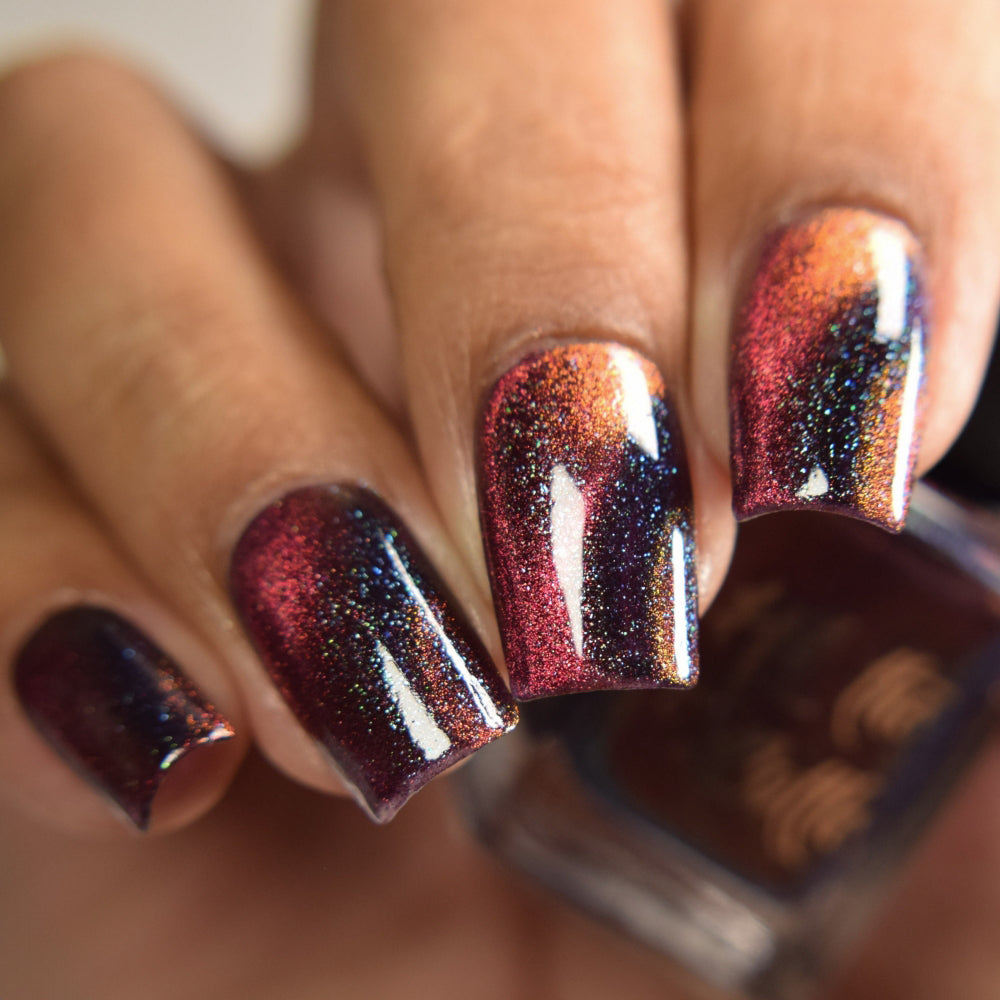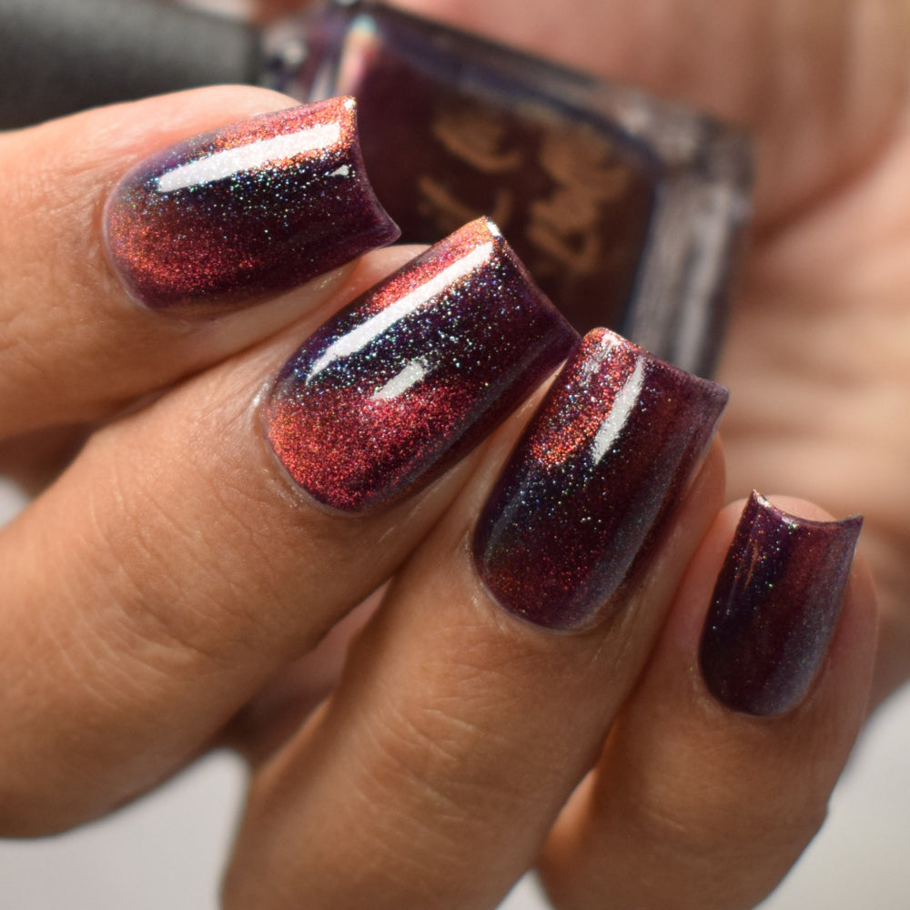 "Screw You Anxiety!" is a deep purple base but on the nail it has a black appearance with very fine green - blue micro glitters. Combined with a magnetic effect that shifts red, orange, yellow to green at angles.